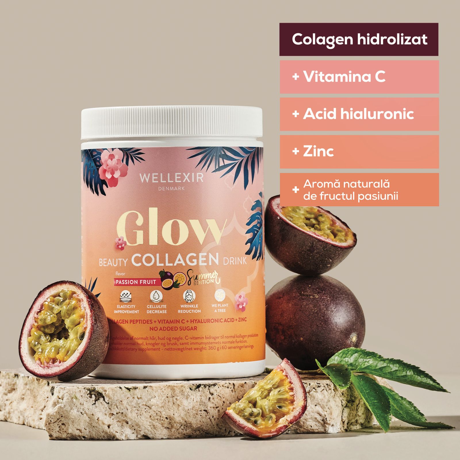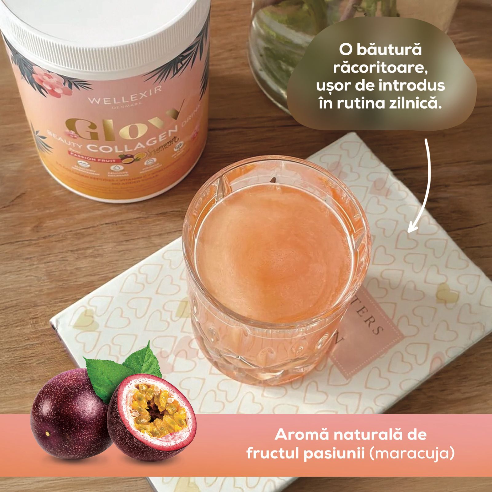 Glow Beauty Collagen Drink cu aromă de fructul pasiunii este un supliment premium, conceput să îmbunătățească sănătatea pielii și să ofere un aspect tineresc și radiant. Formula sa combină colagenul hidrolizat de înaltă calitate cu vitamine esențiale și acid hialuronic, contribuind la menținerea fermității, elasticității și hidratării pielii și nu în ultimul rând având un gust delicios. Acest supliment nu doar că susține frumusețea pielii, ci sprijină și sănătatea părului, unghiilor și articulațiilor, datorită rolului colagenului în regenerarea țesutului conjunctiv.
