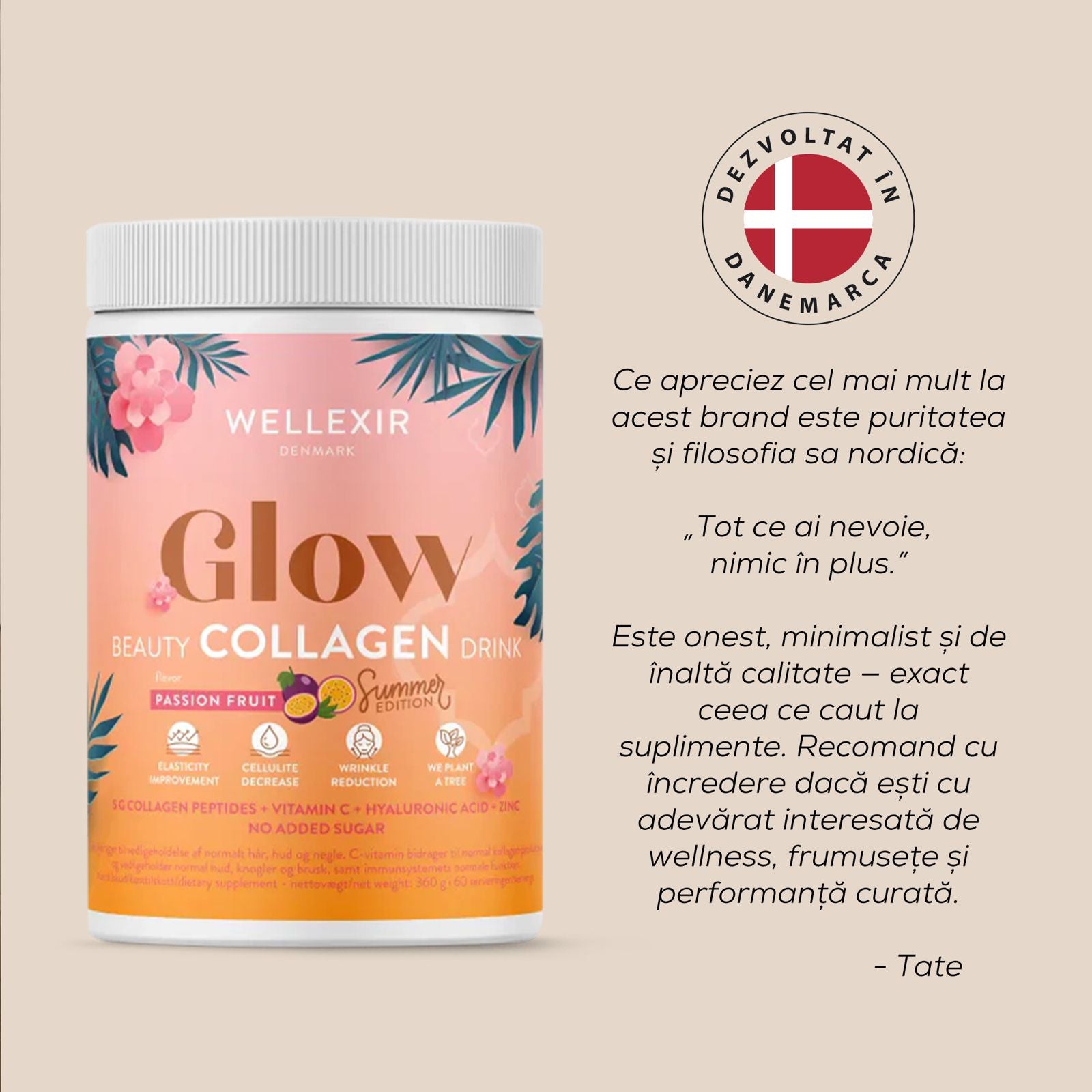 Glow Beauty Collagen Drink este un supliment alimentar natural și, prin urmare, nu poate înlocui o dietă variată și un stil de viață echilibrat. Dacă ești însărcinată, alăptezi, folosești medicamente sau dorești să administrezi Glow Beauty Collagen Drink copilului tău, consultă medicul înainte de utilizare. Nu depăși doza zilnică recomandată și întrerupe utilizarea produsului dacă apar reacții adverse. Păstrează-l într-un loc uscat, la temperatura camerei și nu îl lăsa la îndemâna și la vederea copiilor mici.