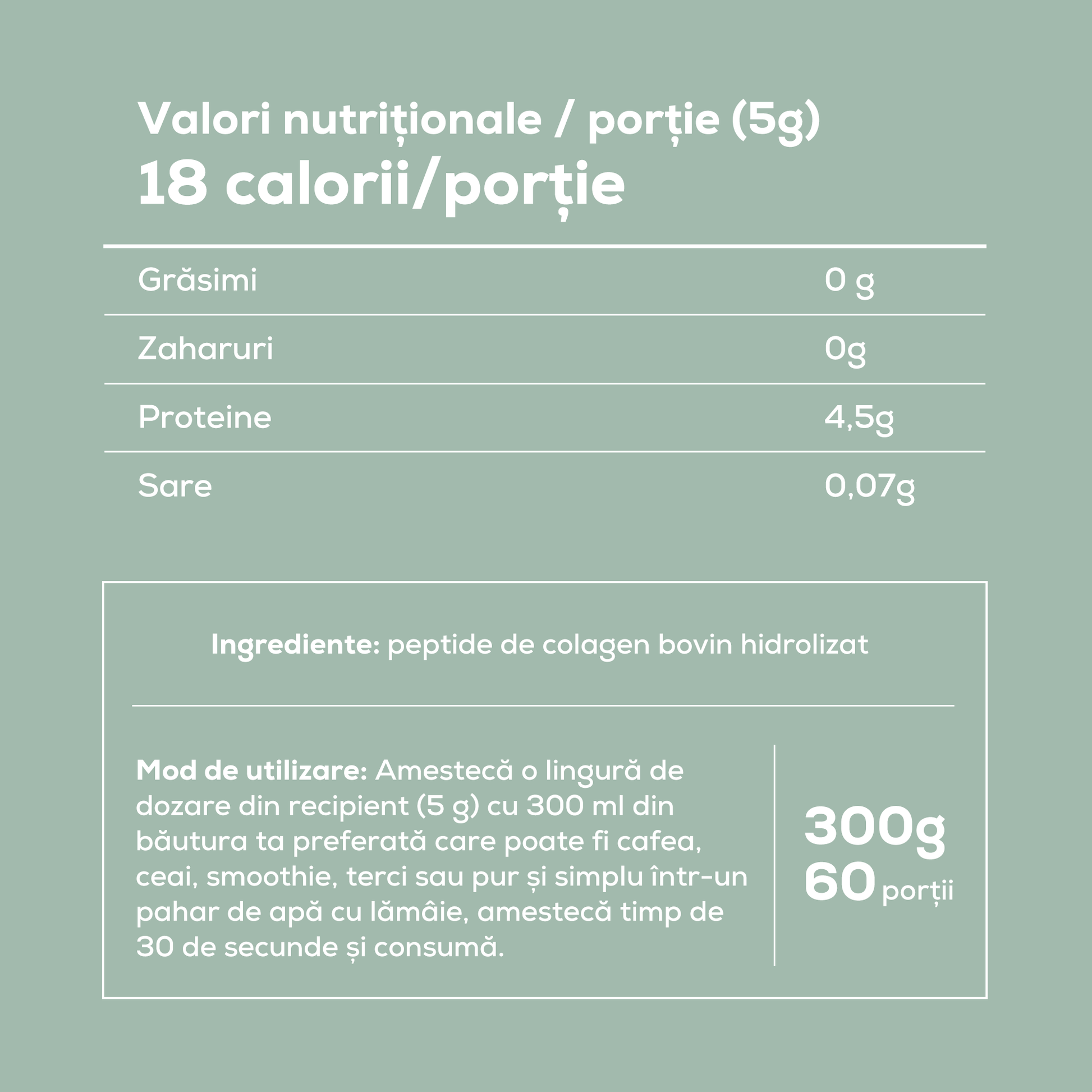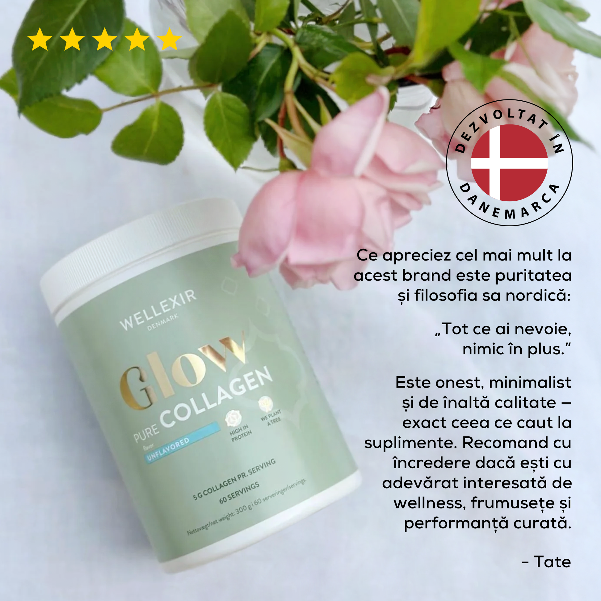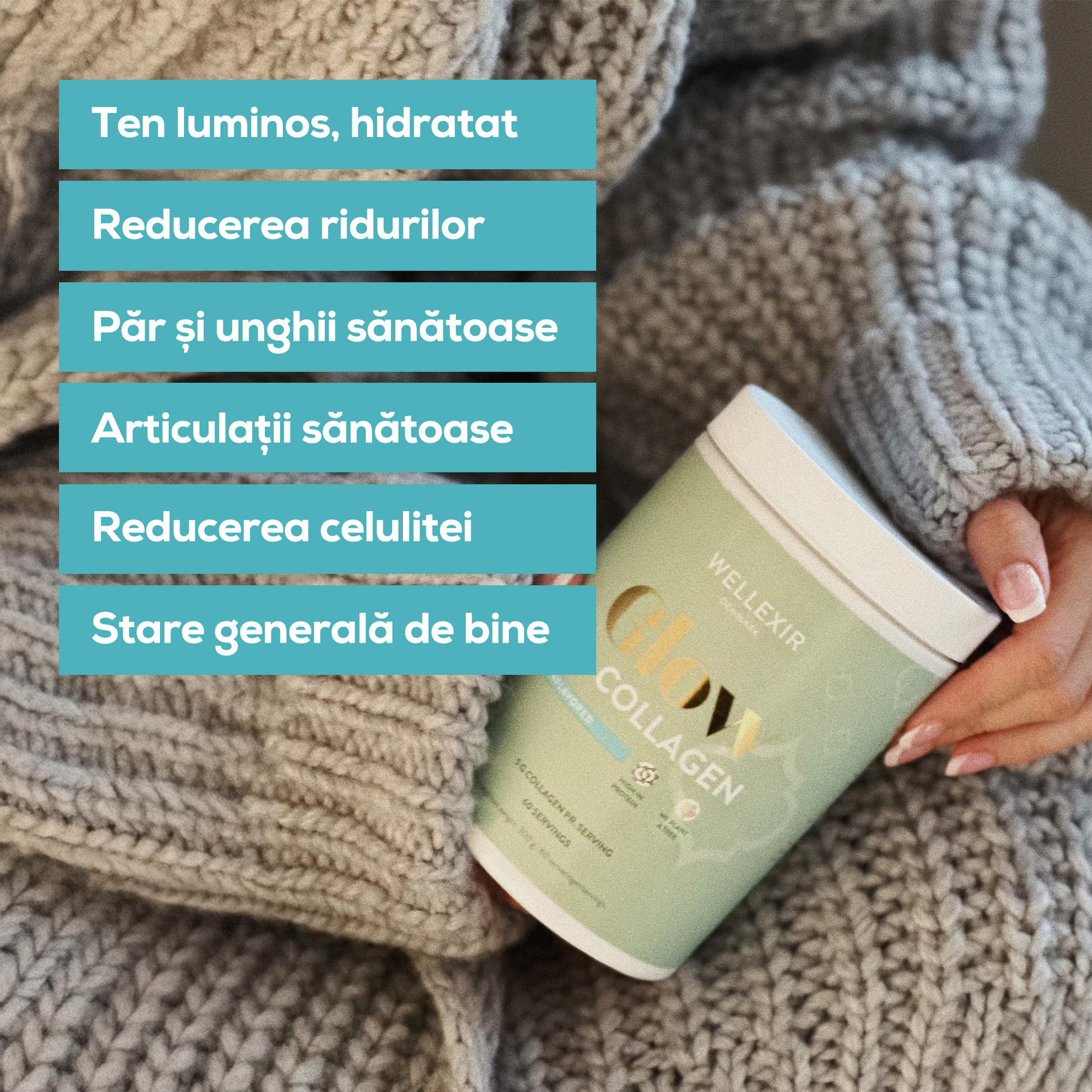 Conținutul ridicat de proteine și nivelul scăzut de grăsimi fac din Glow Pure Collagen un aliat excelent pentru o dietă echilibrată. Colagenul hidrolizat de înaltă calitate contribuie la menținerea elasticității și strălucirii pielii, susținând totodată sănătatea articulațiilor, sprijină sănătatea părului, unghiilor, datorită rolului colagenului în regenerarea țesutului conjunctiv.