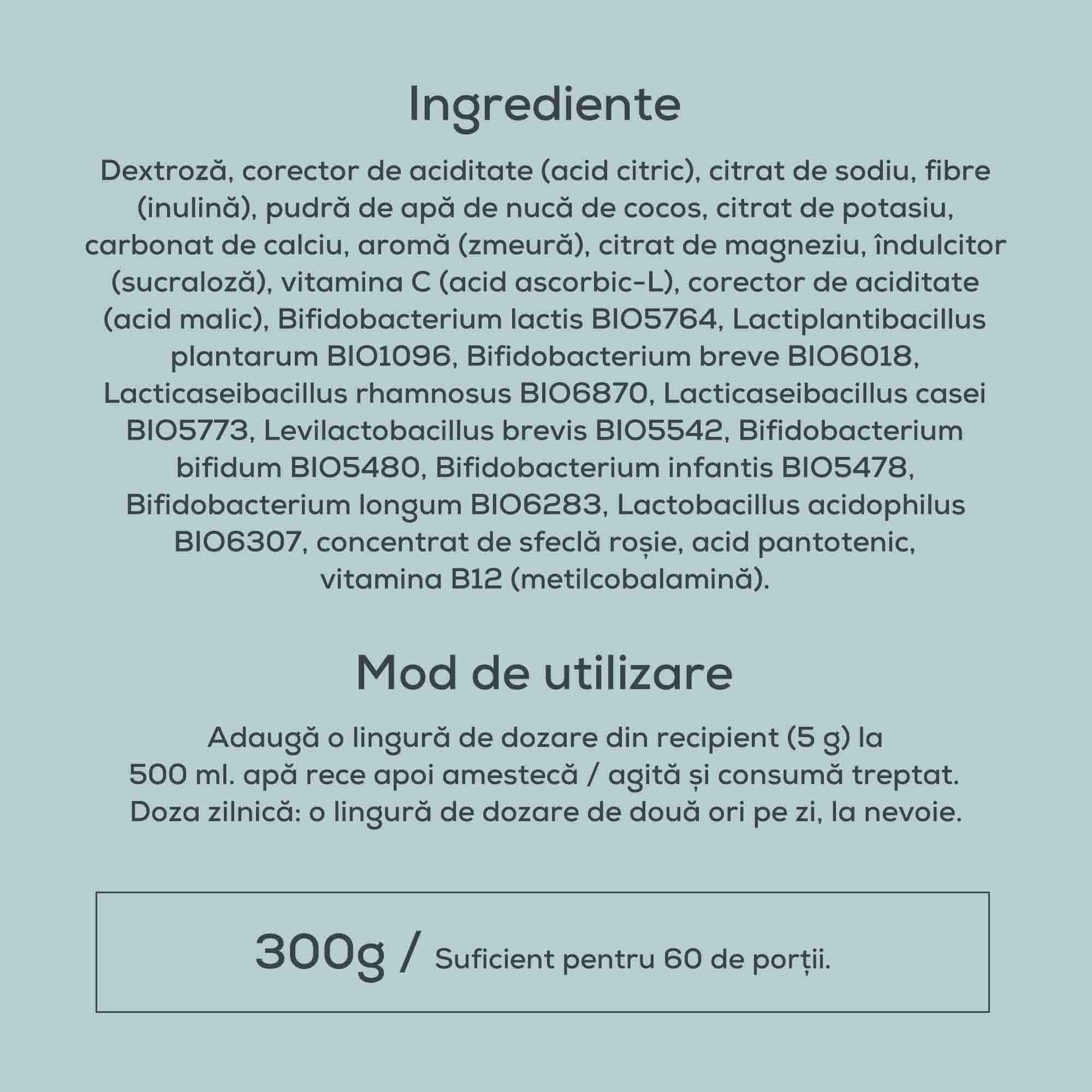 Dextroză, corector de aciditate (acid citric), citrat de sodiu, fibre (inulină), pudră de apă de nucă de cocos, citrat de potasiu, carbonat de calciu, aromă (ananas și lămâie), citrat de magneziu, îndulcitor (sucraloză), vitamina C (acid ascorbic-L), corector de aciditate (acid malic), Bifidobacterium lactis BIO5764, Lactiplantibacillus plantarum BIO1096, Bifidobacterium breve BIO6018, Lacticaseibacillus rhamnosus BIO6870, Lacticaseibacillus casei BIO5773, Levilactobacillus brevis BIO5542, Bifidobacterium bifidum BIO5480, Bifidobacterium infantis BIO5478, Bifidobacterium longum BIO6283, Lactobacillus acidophilus BIO6307, colorant (betacaroten), acid pantotenic, vitamina B12 (metilcobalamină).